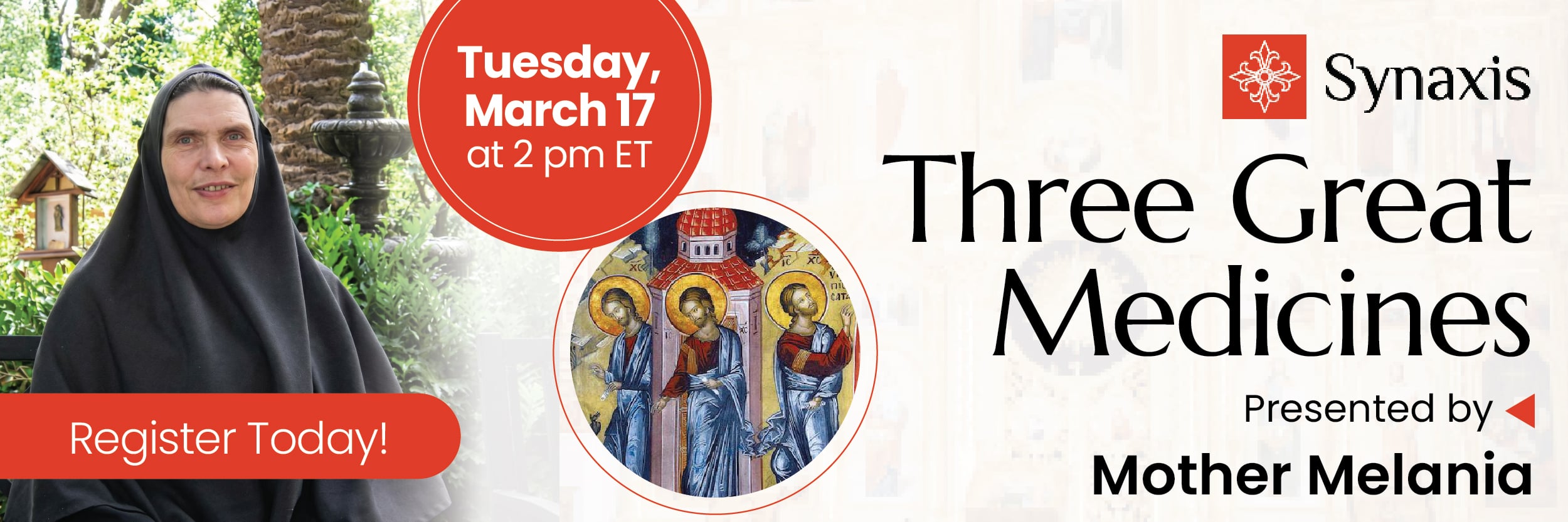 In this live Synaxis presentation, Mother Melania will explore three essential remedies given to us within the Orthodox Christian tradition for healing, renewal, and growth. Drawing from the wisdom of the Church, this session will reflect on the spiritual practices that restore clarity of heart, strengthen faith, and guide us toward deeper communion with Christ.